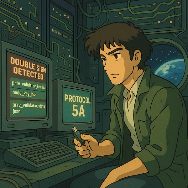 The safety of the entire network rests on the absolute guarantee that a validator identity will never sign two conflicting blocks at the same height. This guarantee is enforced by the validator's static private key in conjunction with a dynamic state file that tracks the last block signed. Loss of control or simultaneous use of these two components—the validator's identity and its signing history—leads directly to a catastrophic network failure initiated by the validator itself. Therefore, any failure in the backup or recovery control sequence that allows the same private key to potentially sign two different blocks at the same height results in an immediate and existential threat to the validator.